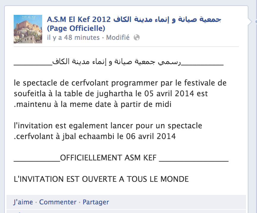 Avant de publier cette information, la rédaction a bien pris la peine de trouver le contact de Ahmed Trabelsi, le président de cette association, qui est lui-même la source de cette information partagée sur Facebook. Et dans une conversation téléphonique, le responsable a longuement hésité à parler et au bout compte a fini par cracher le morceau priant de ne pas le citer ni s’attarder sur les détails qu’il allait donner. Et voilà sa version : « les cerfs-volantistes » étant bel et bien en Tunisie et plus précisément à Sbeitla à l’occasion d’un festival, devraient se rendre au Kef en guise de « cadeau » de la part de la ville de Sbeitla. Or, il s’est avéré que l’administration du tourisme s’était appropriée l’événement avec l’appellation de festival des cerfs-volants, ce qui n’aurait pas plu aux organisateurs du festival de Sbeitla. Et en réaction, ils auraient décidé de tout annuler et qu’il n’y aurait donc pas de cerfs-volantistes pour le Kef. »Après quoi le président de l’association patrimoine et environnement s’est vu obligé d’annuler à son tour son excursion afin d’éviter tout souci avec ses adhérents à défaut de spectacle à la table de Jugurtha.